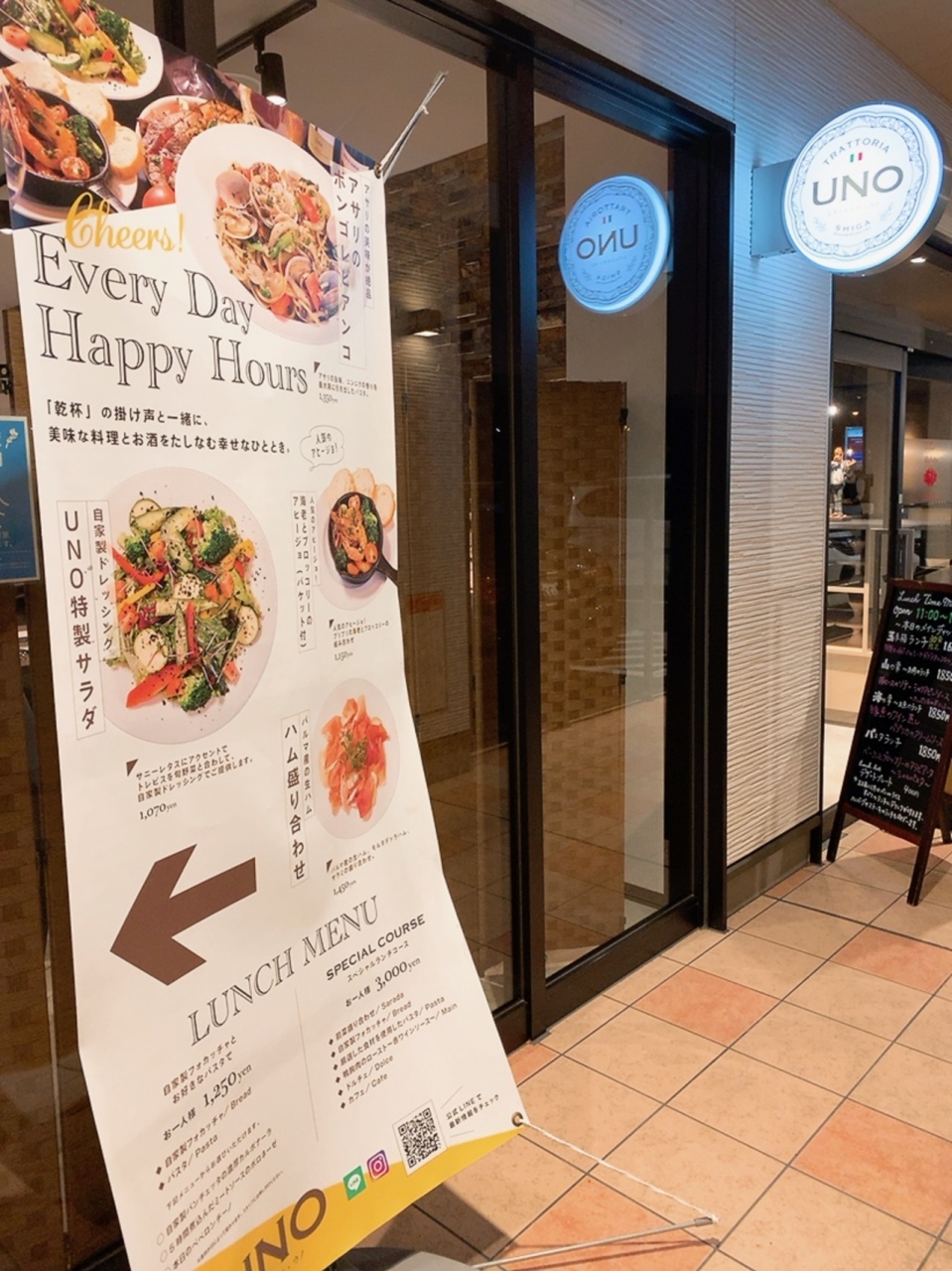 職場の友人とディナーをしたお店です。 近くにお気に入りのパン屋さんがあり、そこに行くたびに、こちらのトラットリア・ウノも気になっていましたが、ようやく行くことが出来ました! 南草津に建った、かがやきテラスという施設の1Fに入るお店です。 店舗の面積は小さくて、カウンター席が7,8席ある以外は、テーブル席が3つのみなので、こじんまりとしたお店です。