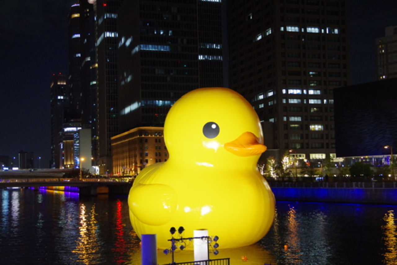 写真撮影すると、バックのビル群とのコントラストが面白すぎます! 夜になると、15分に1回の噴水ショーも行われるので、ライトアップされた噴水とラバーダックの共演もなかなか楽しいです。