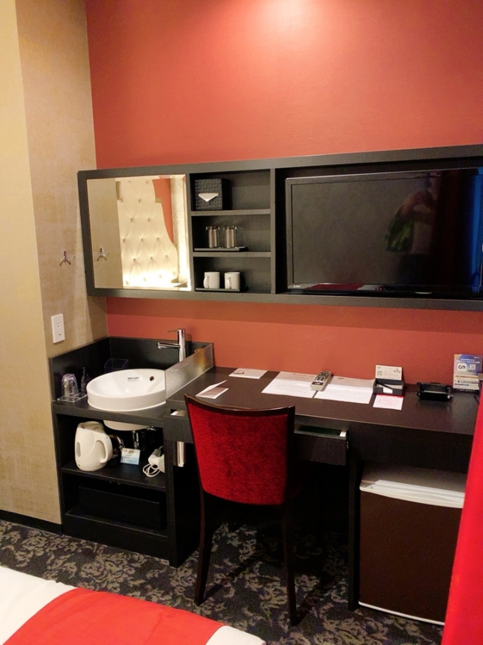 こちらのホテルはコンセプトがなかなか面白くて、フロアごとにテーマを決め、1Fが出発(Departure)となっていて、海外の有名観光都市をイメージした内装のお部屋に宿泊出来ます(ちなみに、2Fは博多)。 フロアを指定すると宿泊料が高くなるので、部屋のグレードだけ決めたところ、9Fのイタリア・ローマに案内されました。
