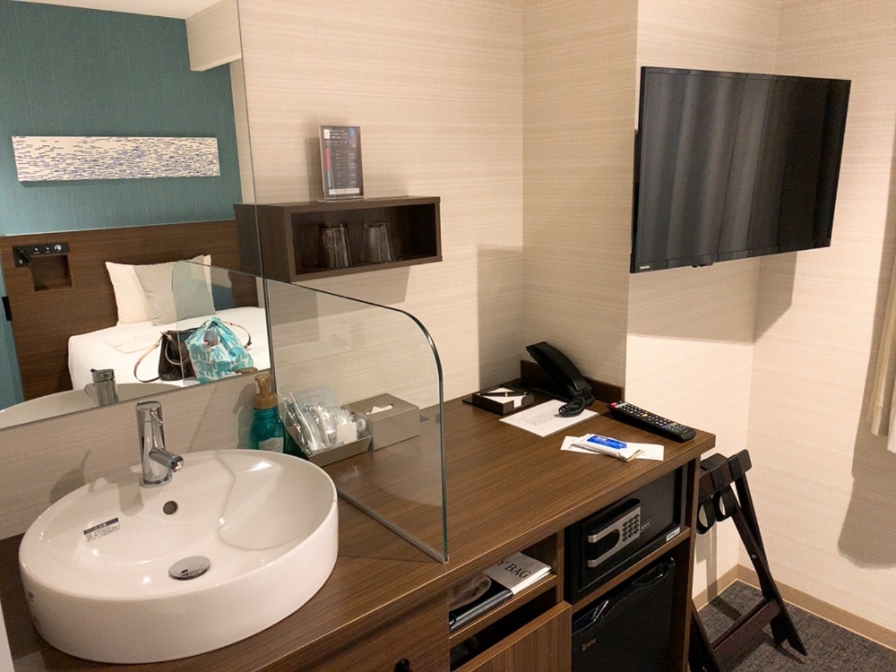 お部屋の中に洗面台がある、珍しいタイプのお部屋でしたが、その理由は、お風呂が洗い場のある広いお風呂で、ユニットバスじゃなかったからです。 最近は、価格設定が安いビジネスホテルでも、こういう広いお風呂が設置されてるホテルが増えてるので嬉しいです。