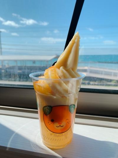 キレイな海を見ながら、伊予柑ソフトを楽しみました! みきゃんグッズも色々揃います。