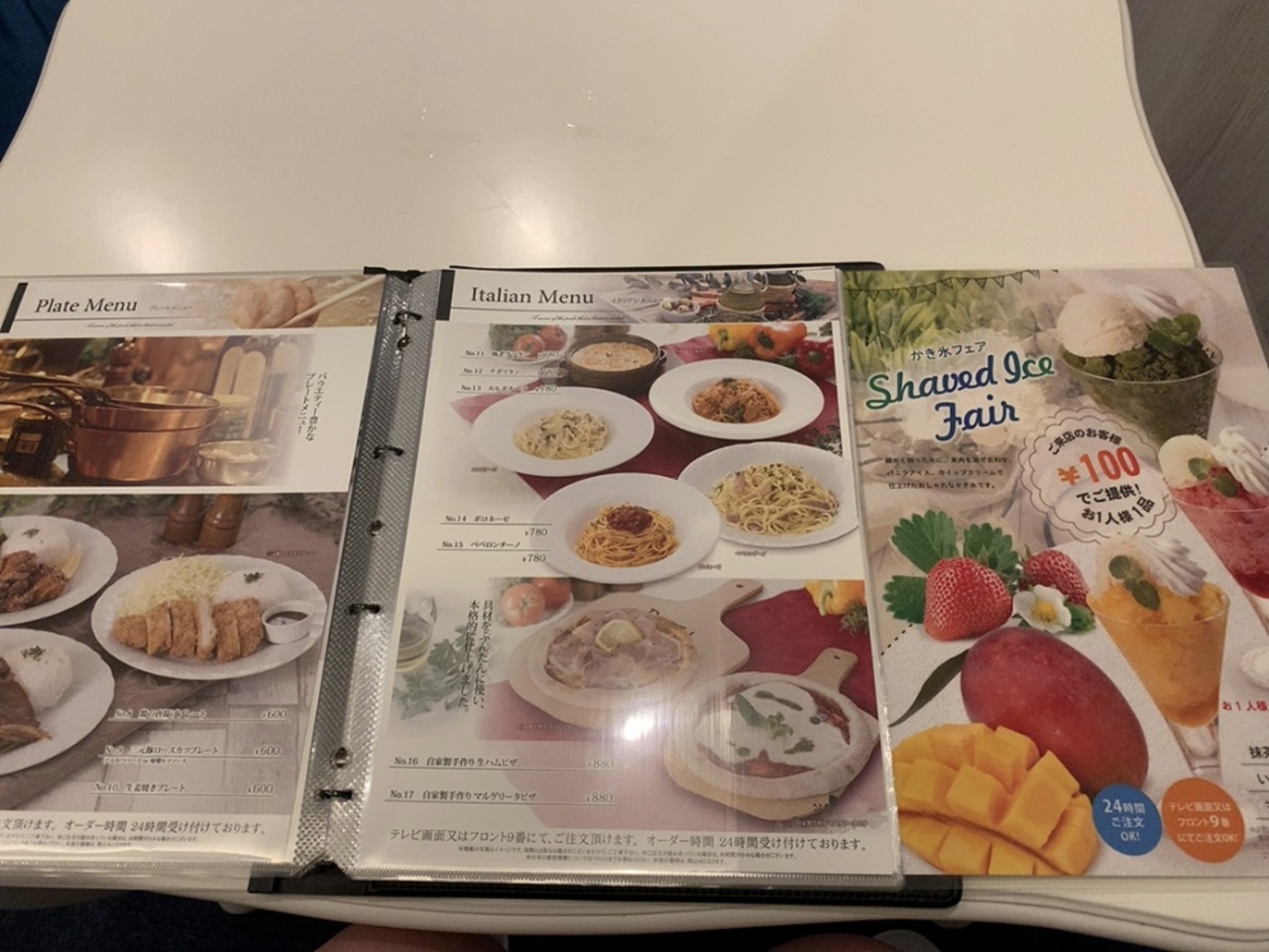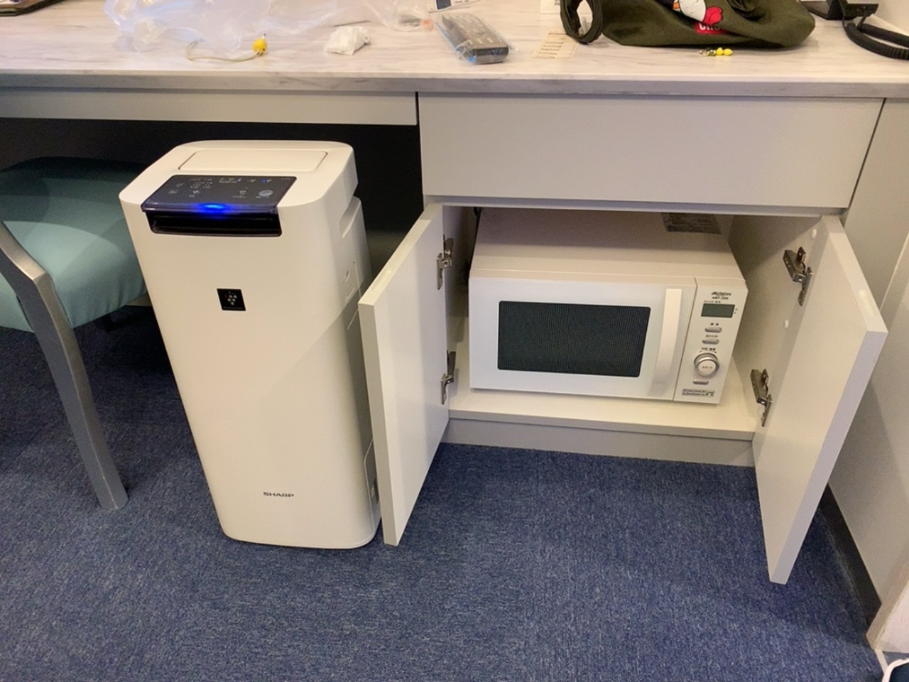 ベッドも快適、テーブルや椅子などもちゃんとあったので、室内でのテイクアウトディナーも楽しめました。 ルームサービスのメニューが、まるでカラオケBOXのように豊富なのもユニークに感じました。 お部屋に冷蔵庫だけじゃなくて、電子レンジもあります。