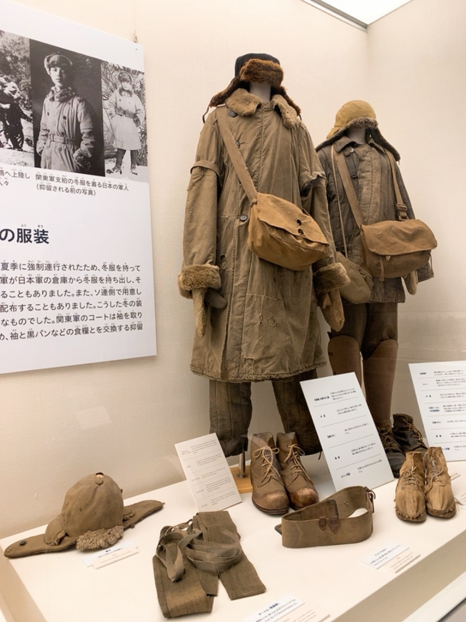 戦後、日本に帰りたくても帰れなかった、抑留を強いられた方々の記録や、資料が展示されていて、私が訪れた日は他の見学者がいなかったので一つ一つ、資料の説明なども読みながらゆっくり見学出来ました。 シベリアなどでの抑留生活をしていた方々は、支給される食糧も少なく、生き延びるためにコートの袖を取り外して、パンなどの食糧と交換する人もいたとか。 当時のコートが展示されていて、マイナス30度(もっと寒い?)の極寒の地では耐えられなそうな生地に見えました。