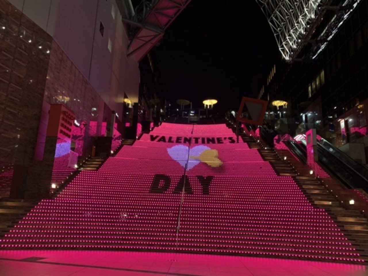 1月だったので、ちょうどこの時期は、バレンタインバージョンでした。 ちゃんと、どのようなスケジュールで何分間のどのようなコンセプトのイルミネーションなのかが、壁に案内されているので、写真を撮りたい場合も、動画として撮りたい場合も事前に準備出来て良いと思います。