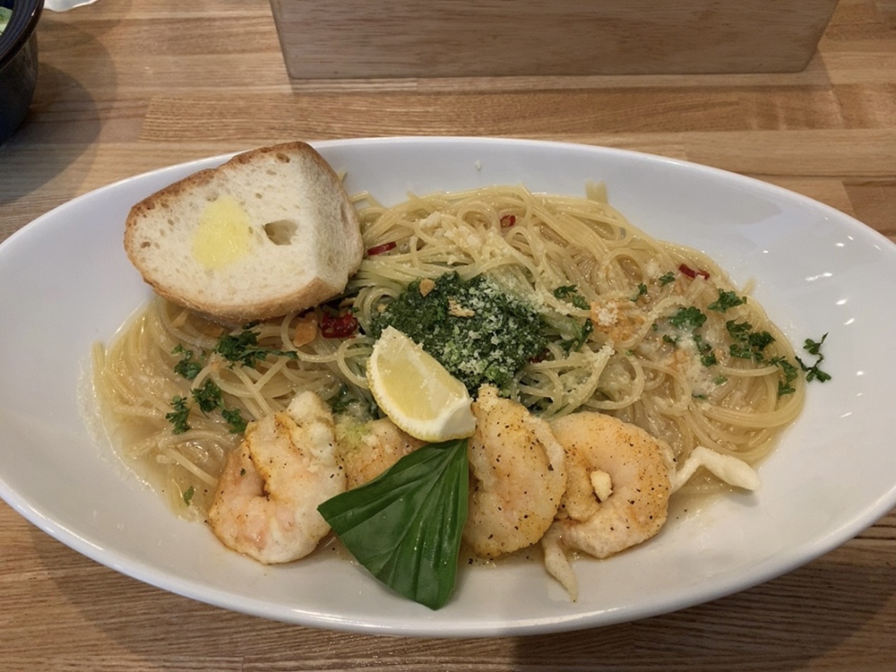 この日選んだのは、キングオブパスタで1位を獲った事もあるメニューの1つでもある、人気ナンバー1の、えびジェノパスタ。 このお店は、ジェノベーゼ系、ガーリック系がお得意メニューなのか、結構種類が多い気がしました。