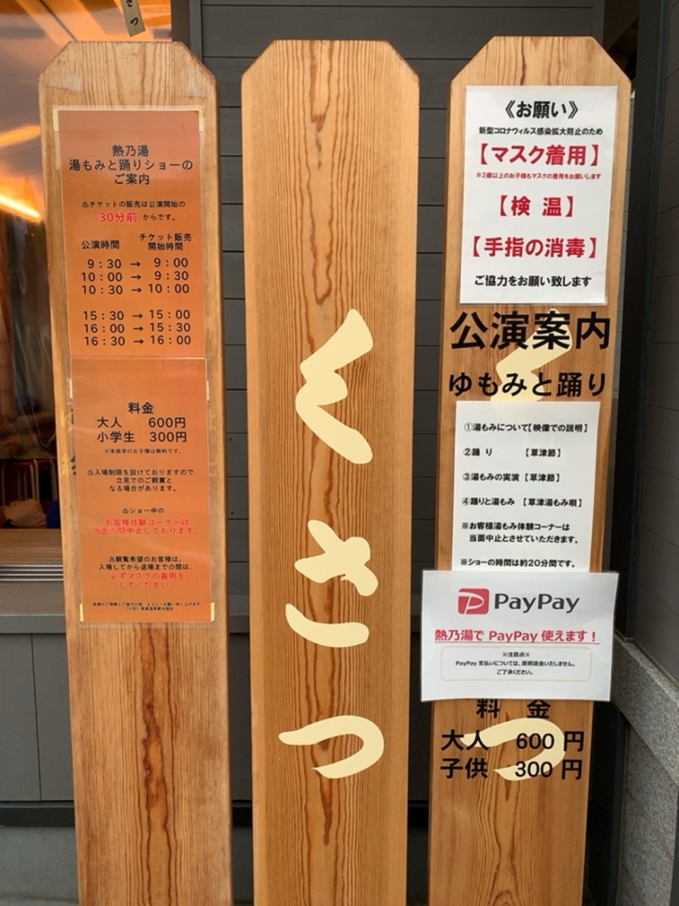 草津温泉を訪れた時に、湯もみショーを見学しに立ち寄りました。 お盆休みだったからなのか、かなりの行列になってました! コロナ禍で入場人数の制限をしてるかどうかは分かりませんでした。 PayPayで支払いができるのは便利でした!