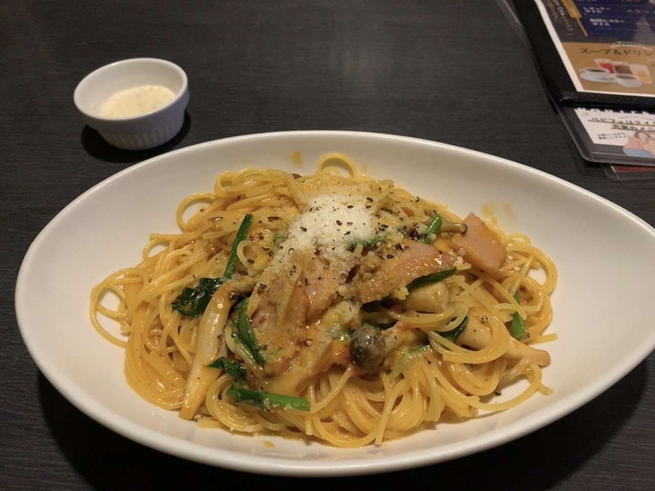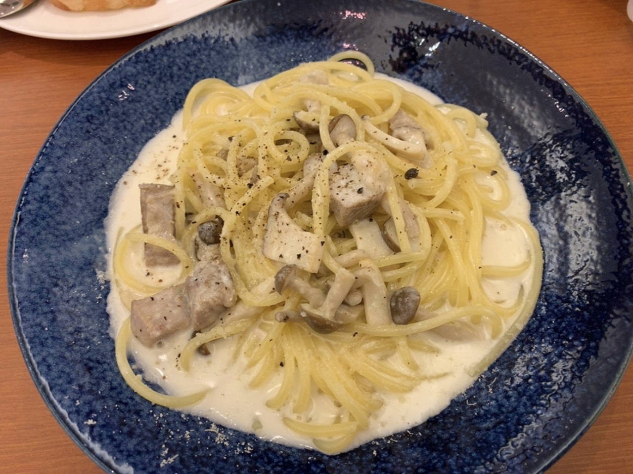 久しぶりに前回とはちょっと違うメニューを頼んでみようと思い、キノコベーコンミートクリームパスタを注文。 黒コショウが粗挽き過ぎてちょっと辛い感じもしましたが、パスタ自体はなかなか良いお味でした。 トッピングでグラナパダーノチーズを100円で追加したので、粉チーズをたくさんかけて食べることが出来て美味しかったです。