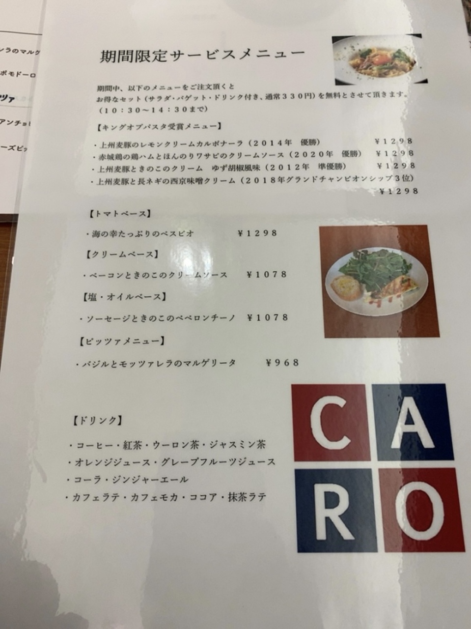 パスタのコースは、単品、前菜付き、サラダ・ドリンク・デザート付き、フルコースなど4種類から選べます。 私は今回もデザートの付いたレディースコースをチョイス。