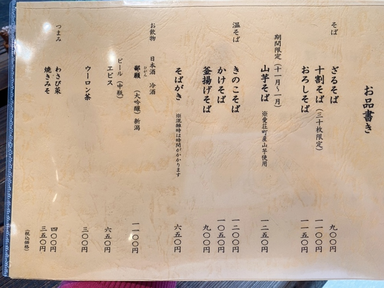メニューはざる蕎麦以外に数種類しかなく、数量限定で十割そばもありますが、この日はもう終了してました(4年前に食べましたが、通常の蕎麦とそこまで変わらなかった覚えがある)。 天ぷらなどのメニューはない、シンプルなお蕎麦のみで勝負するお店ですが、繊細なおそばはとっても美味しいのでオススメです!
