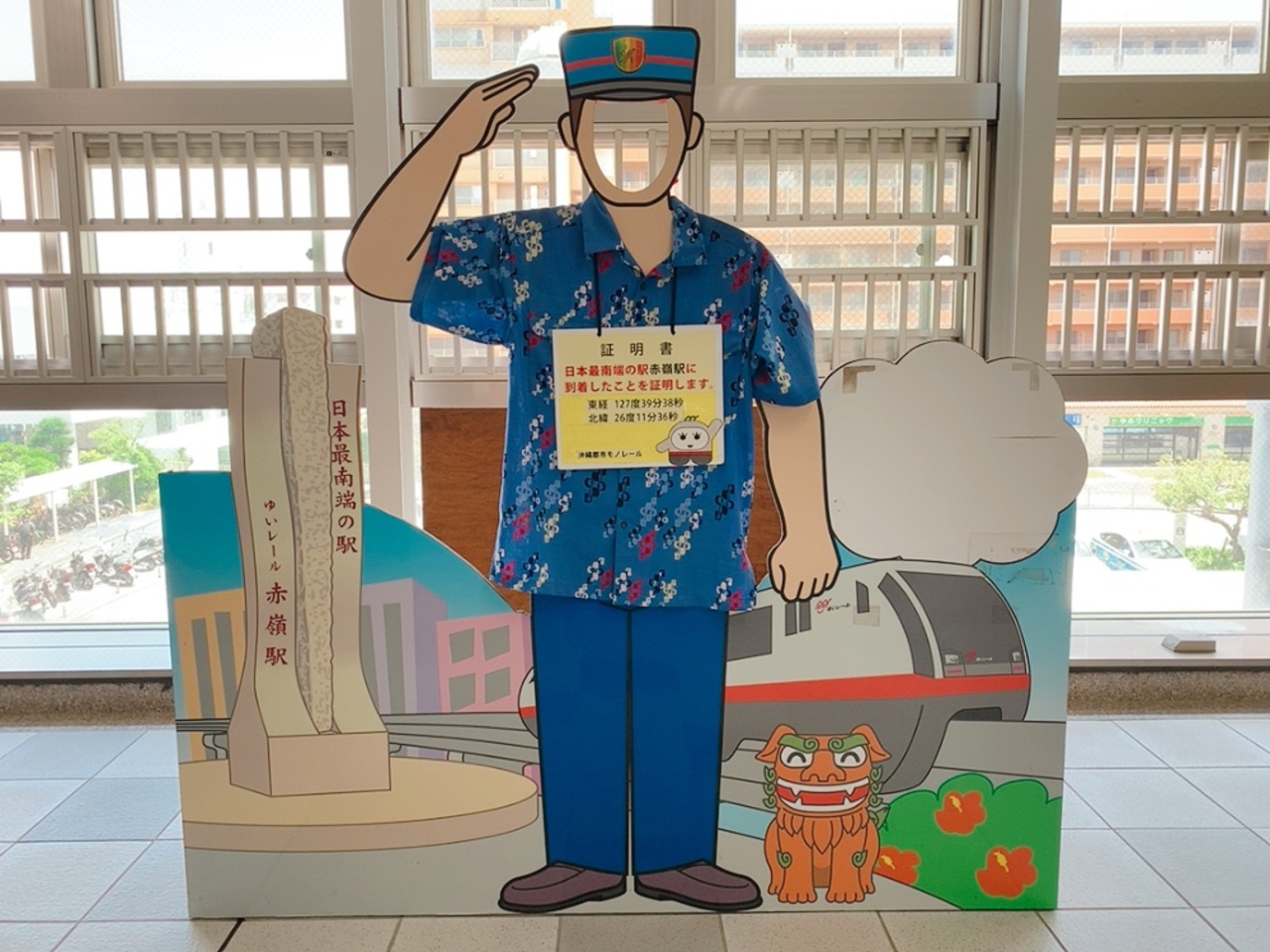 日本最南端の駅! 顔ハメパネルがあるので、日本最南端の駅員になって写真撮れます!