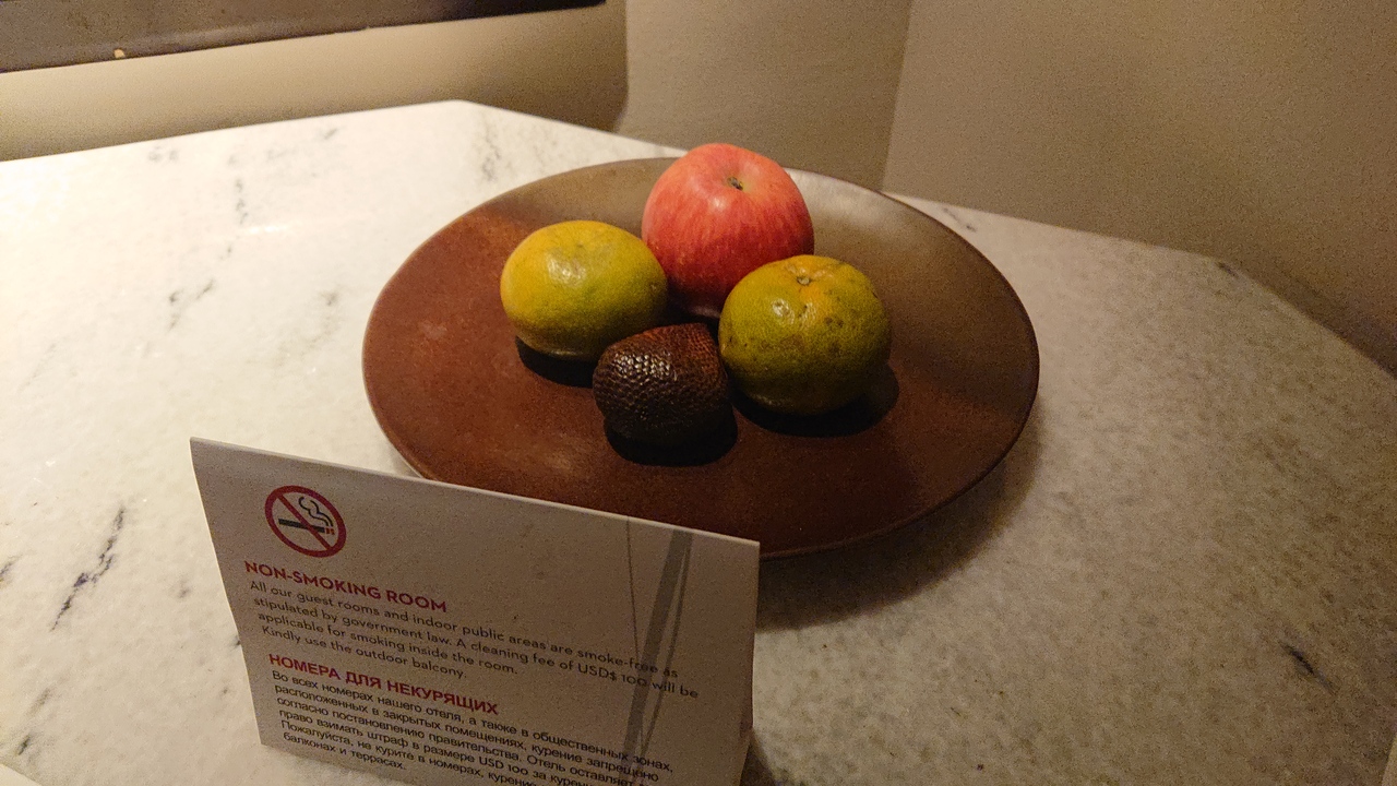 窓が空いたまま出かけていて、戻ってきたらウェルカムフルーツのリンゴをリスがかじってました。