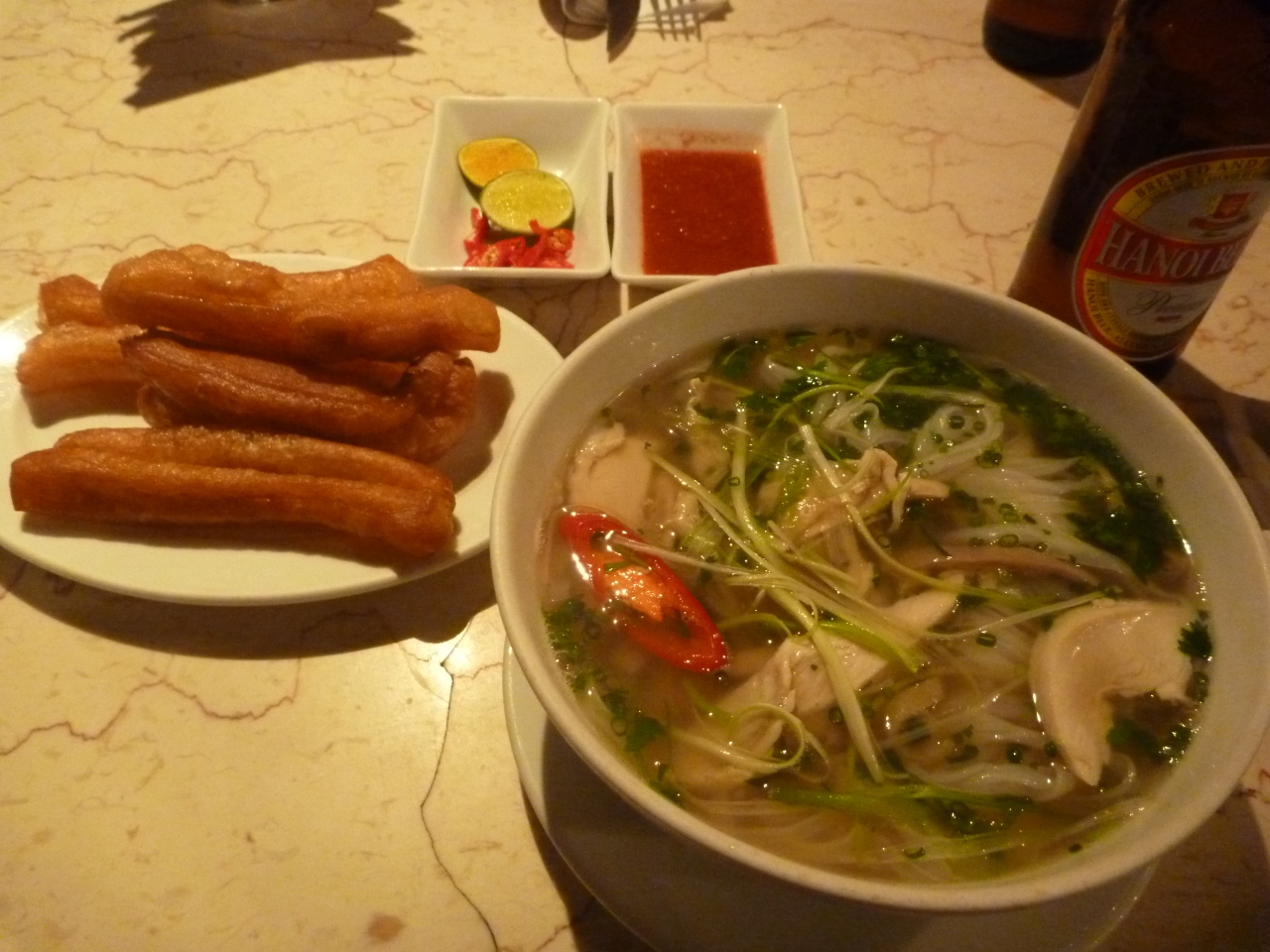 夕食の場所を探して人形劇場の周辺を歩いていたら、きれいなアオザイの女性に、誘われました。メニューを見たらフォーがあったので、入店しましたが、ビルの4階でちょっと不安になりました。しかもガードマンもエレベーターに同乗します。