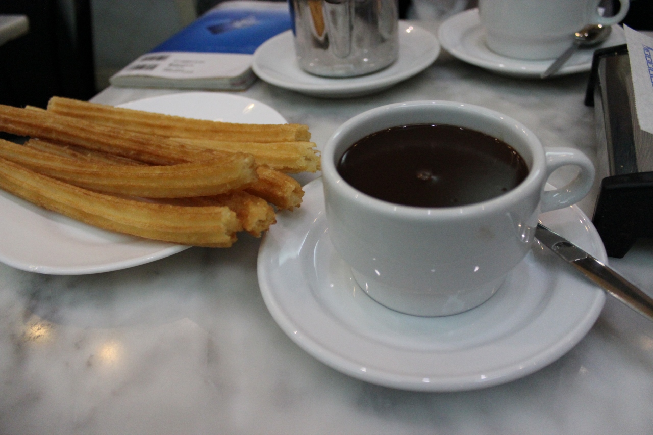 ホットチョコレートに揚げたてのチュロスをつけて食べます。