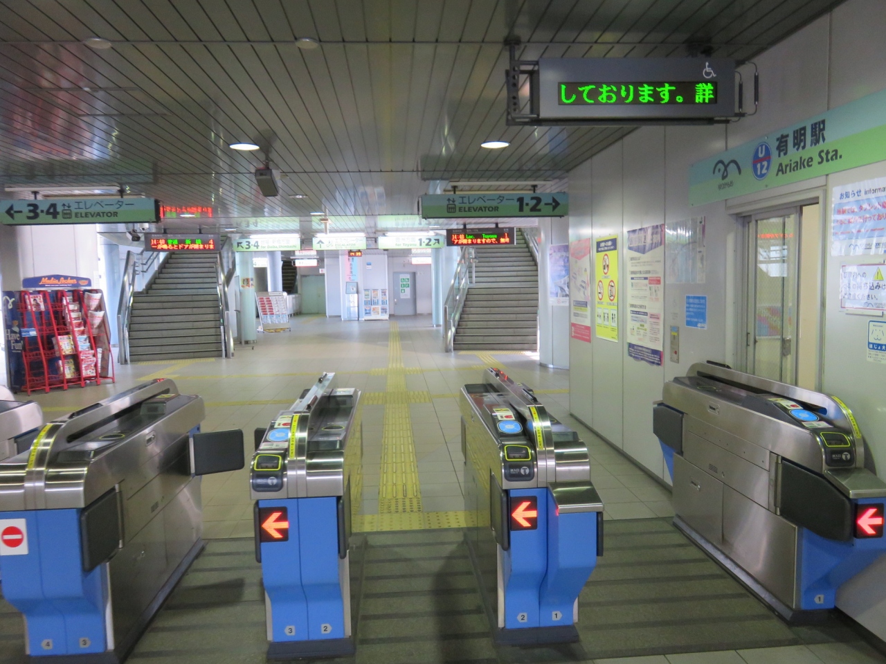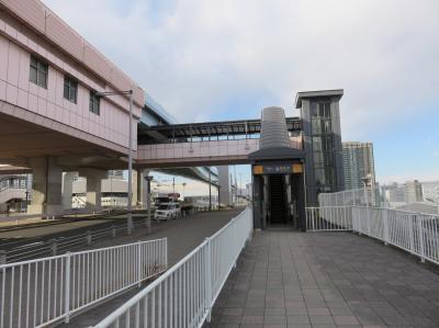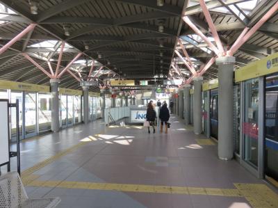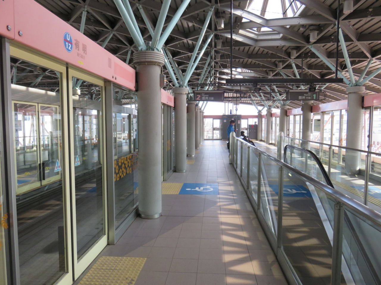 此方の駅は 3線2面の島式ホームです。2番線と3番線で線路を共有するので、4線ではありません。此処から東京ビッグサイト方向を見ると引き込み線が見えます。ビッグサイトの方へ伸びている線路が車庫へ向かう物になります。ビッグサイトの東ホールの展示会場を出て、エスカレータで上に昇るとエントランスに行く動く歩道がありますが、その右手前にドアがあり、皆さんがよく煙草を吸っていますが、此処から真っすぐ出てきて階段を下り、横断歩道を渡り、病院の前を過ぎると有明駅のエスカレータがあります。日台側に見える幌馬車仕様の建物が「りんかい線」の国際展示場駅です。混んでいるときは このルートが空いています。