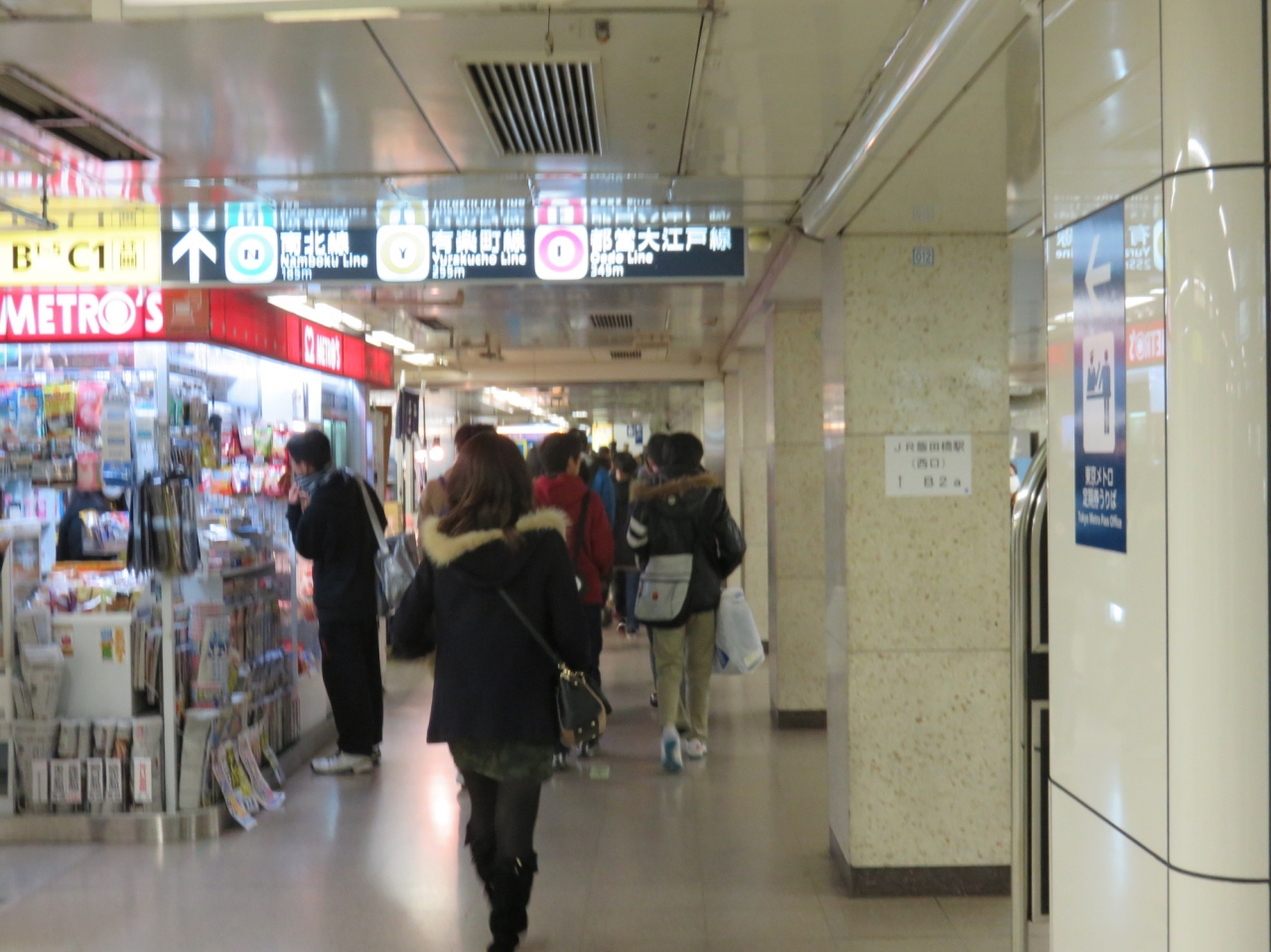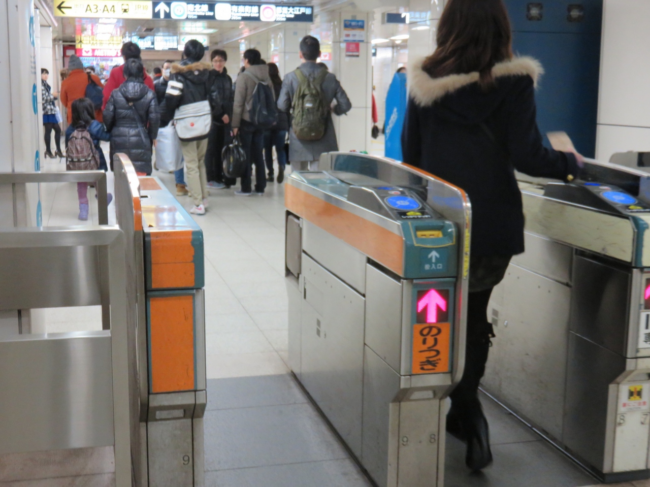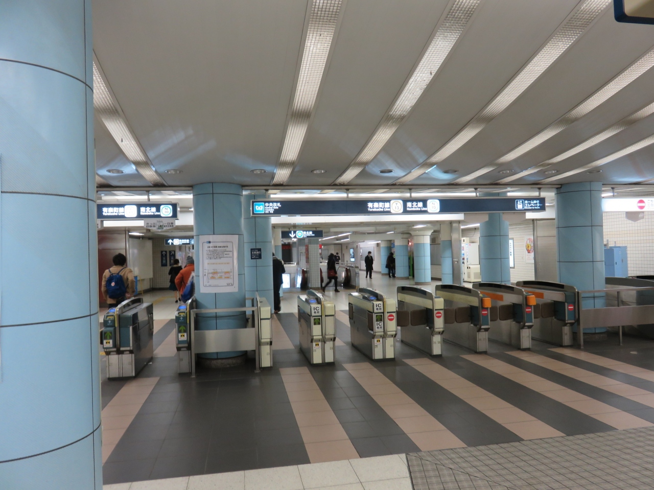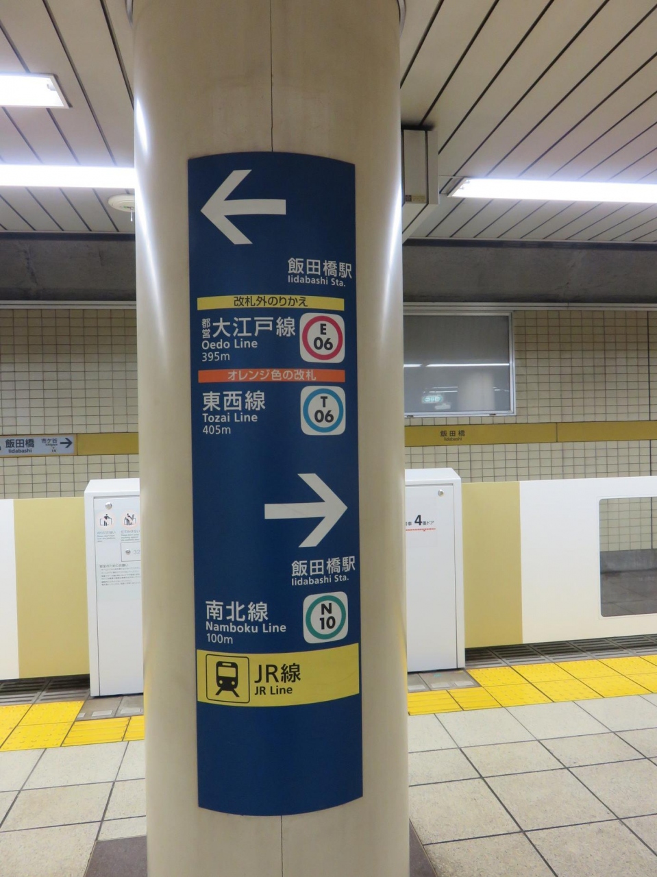 東京メトロ東西線の飯田橋駅は2線2島の対面型ホーム、有楽町線は2線1島です。今回は 東西線から有楽町線への乗り換えです。東西線は 中野駅側の車両に乗ると便利です。乗り換えのためには改札を出ます。此の時、ICカードの方はオレンジの改札機を通過しないと下車駅だと認識され、次の改札では 初乗り扱いにされます。料金が高くなります。人の流れに乗ると改札機の色が分かりません。注意してください。有楽町線のホーム案内で気が付きましたが、都営大江戸線は乗り換え扱いが無いので、通常の改札を通る必要があります。