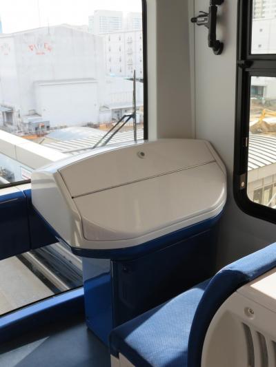 東京ビッグサイトへ行くのに利用しました。新橋側から乗ると遠回りになるのと料金が高いので、何時も豊洲側から乗車しています。時間つぶしに撮影しながら乗り込み、先頭車両に移動すると、運転席に帽子をかぶった人が?気合の入った「鉄ちゃん」かと思ったら、運転台のカバーが空いている。本物の運転手さんでした。対向車両は運転手の代わりにお客さんが座っているので、此の車両のみ手動運転(?)でした。可なりの驚きでした。