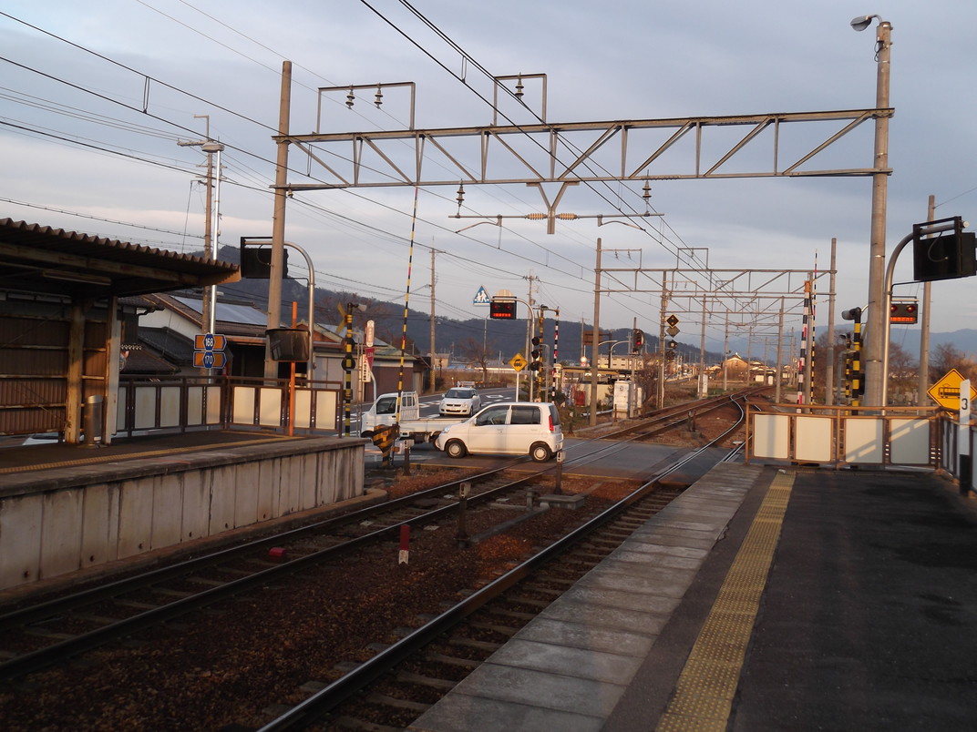 近江鉄道の市辺駅で電車を待っていました。駅は 完全な無人駅で、周囲に自動販売機くらいしかありません。何軒か家はありますが、営業していなさそうな店舗らしきものが1,2店あるくらいです。ホームは線路を挟んだ対面式です。やってきた電車は 西武鉄道で使っていた払い下げ品でした。乗り心地は良くありません。線路が悪いため、左右に揺れます。