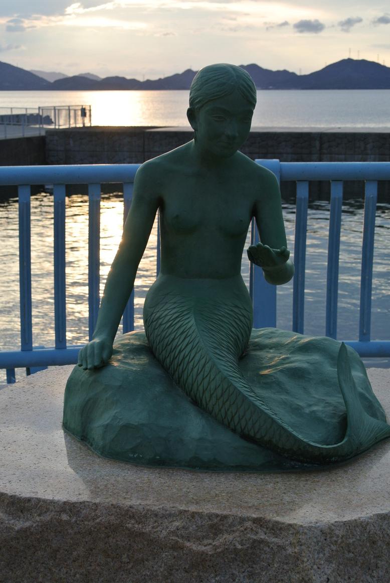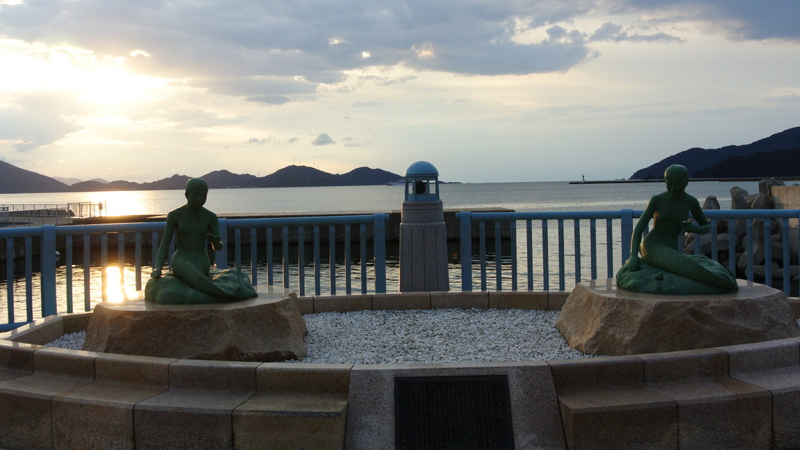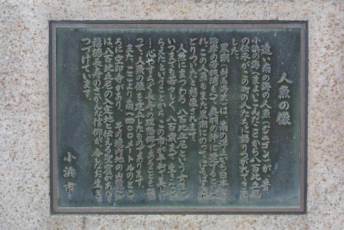 27号線から、小浜方向へ曲がってくると海岸線につきあたります。車で来るとT字路の正面に見えます。人魚像とプレートがある一寸した広場です。それ以外は何もありませんので、此処にとどまる人はほとんどいません。但し、マーメードの後方に日が沈みますので、撮影されるのであれば日没をお薦めします。日が沈む方向に原子力発電所が隠れています。