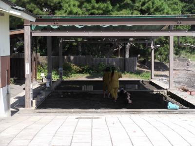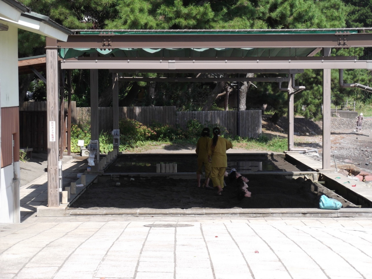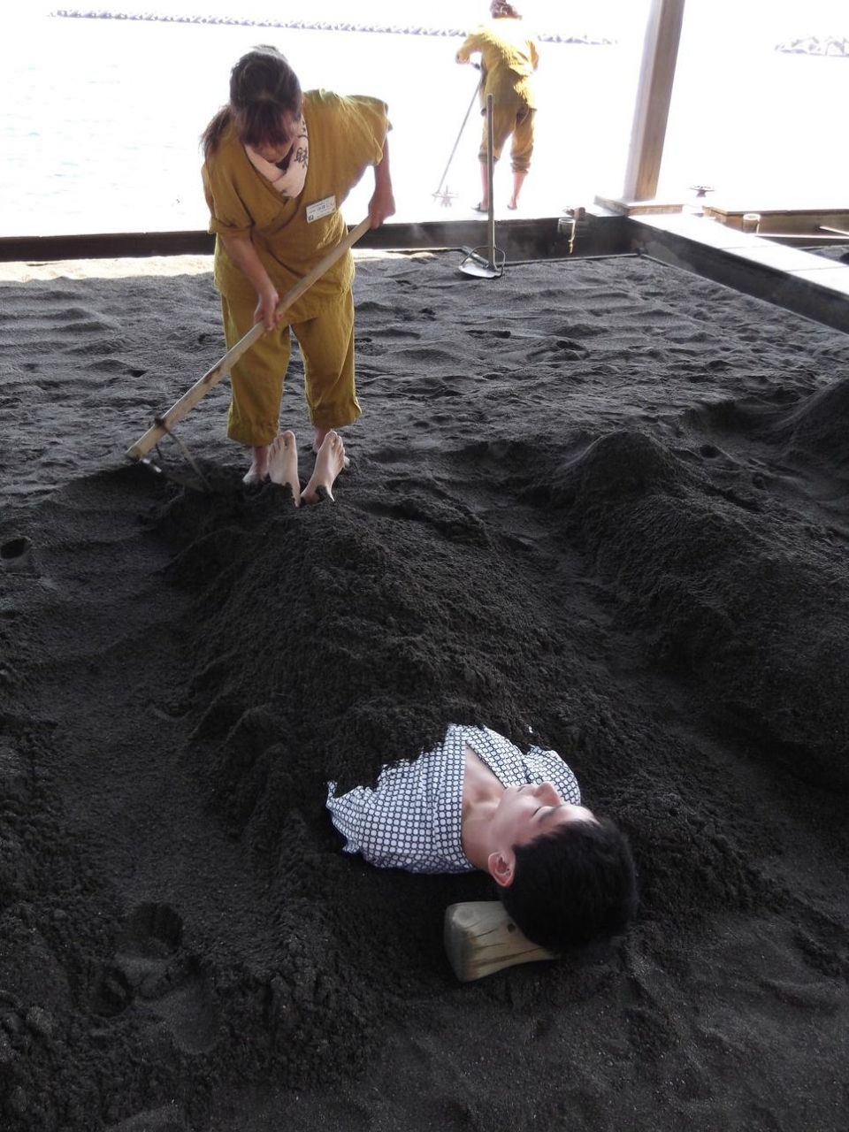 初めての砂湯体験でした。入り口で料金を支払い、脱衣所で浴衣に着替えます。当然、全裸に浴衣です。外に出ると砂場が2か所あります。場所は 係りの人の指示に従ってください。寝っ転がると上から砂をスコップでかけてくれます。砂って重い物だと肌で感じられます。かけ終わると、じっとしているだけ。波の音と顔に当たる風が心地よくウトウトします。そして大量の汗も。屋根の内側に太いパイプがあり、お客さんが来る前に温泉を張っておき、砂を温めておくみたいです。ですから、タイミングによっては待たされることもあるようです。その状態で、係りの人が写真を撮ってくれました。カメラもお忘れなく。砂湯から出ると、別の更衣室に入り浴衣を返却ボックスに砂ごと返して、シャワーで砂を落として温泉につかり、元の更衣室で着替えて終了です。汗疹の出来やすい人には勧めません。汗疹ができます。出た人がいました。