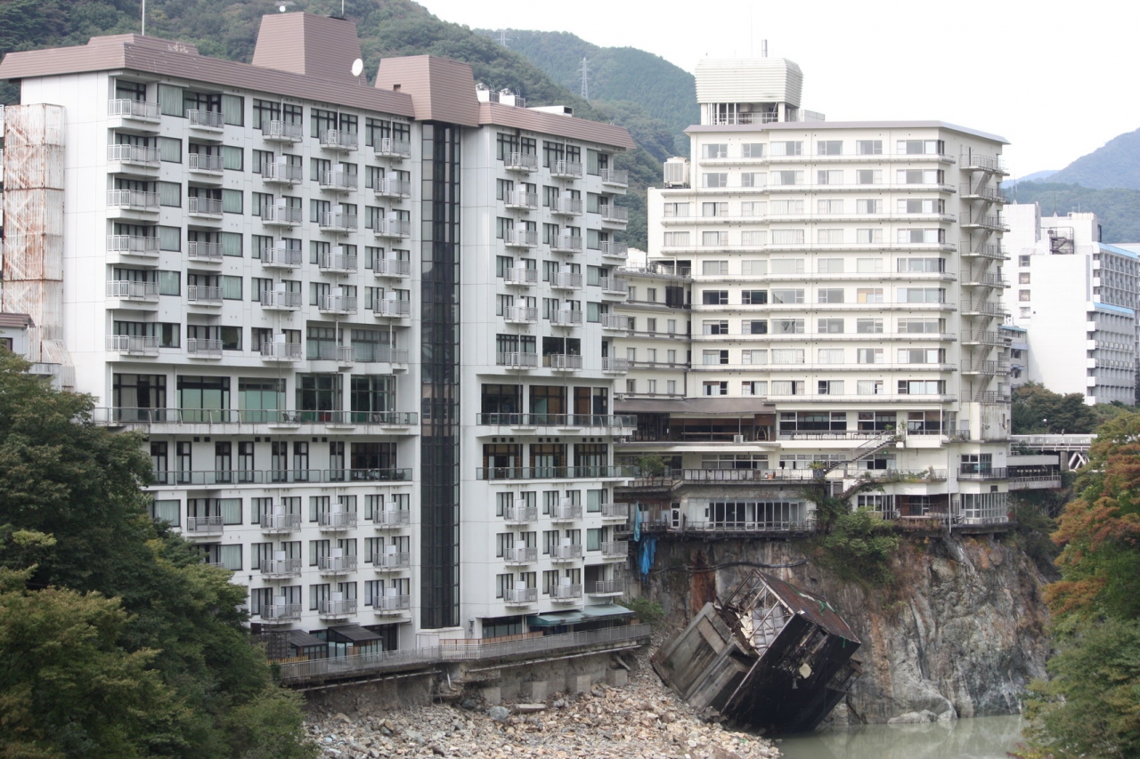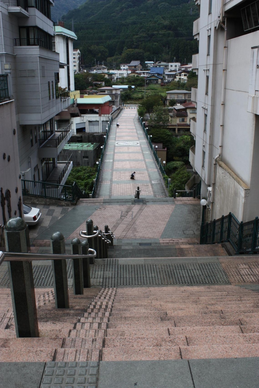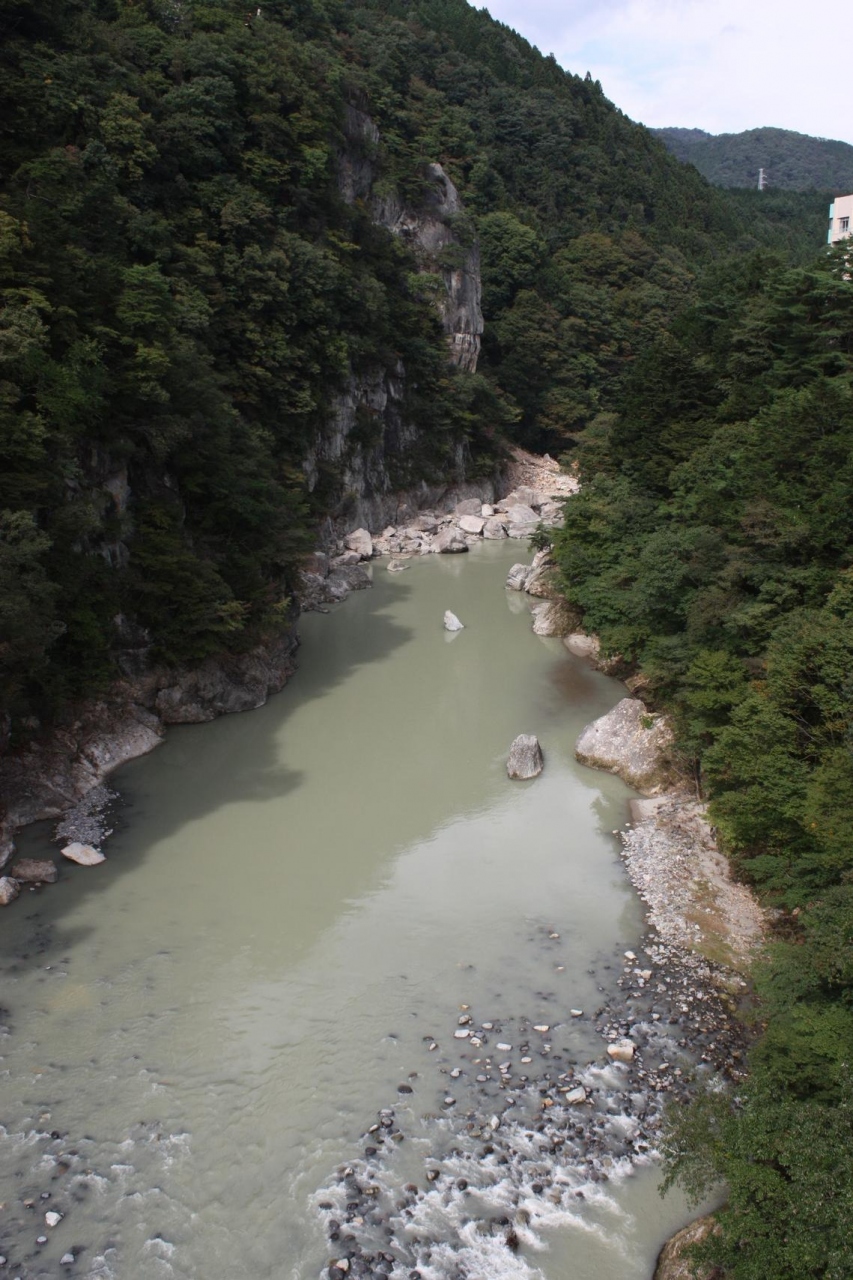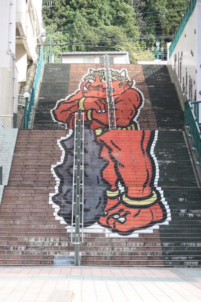 駅から徒歩で徒歩で訪れました。途中の旅館が閉鎖して居たり、土産物屋も閉まっており、日曜日の昼なのに閑散としていました。案内板に沿って左に曲がると長い階段の下に橋が見えました。此処から見ると旅館街にある橋にしか見えませんでした。橋の反対側まで行きついてから振り返ってください。鬼がいます。階段に。橋の中央からは大雨で落下した旅館の温泉施設が見えます。解体するにしても大変な作業かと思います。大雨の影響を引きずって閑散としているのであれば、少しは希望が持てますが。寂しい温泉街でした。