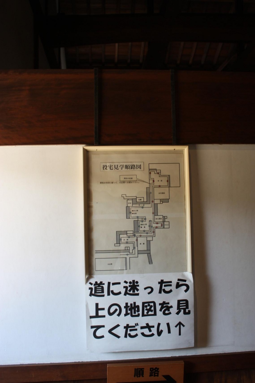 入る前は陣屋の内部見学程度に思っていましたが、内部が広いのにはビックリしました。畳の縁が有るのは男性が使う部屋、縁の無い部屋は女性が使う部屋となっているそうです。確かに見ていると部屋によって縁があったりなかったりしていました。最近では 畳の補強の意味で縁が使われているのですが時代が変わると意味するところも変わるみたいですね。建物内に順路の矢印が有ります。これに沿って行けば迷子にならないのですが、一回、順路を外れると、どの矢印に沿って行けばいいのか判らなくなります。同じ通路を使うので見る方向が変わると矢印も違う意味(途中を飛ばして出口に誘導される)を持ちます。
