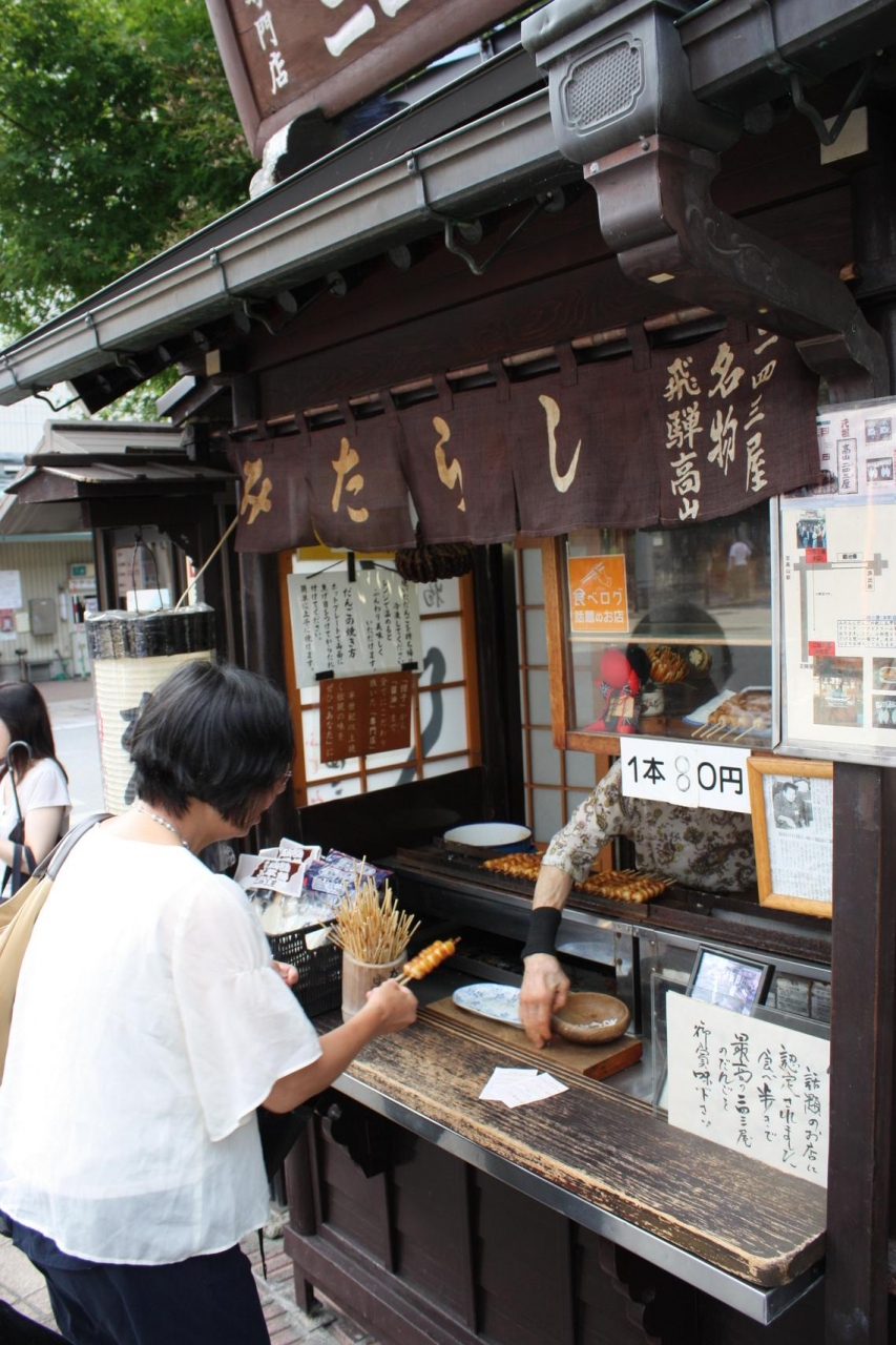 夕食まで時間が有るのと、街並みを見ながらの散策を兼ねて鍛冶橋にやってきました。お目当ては 此処のみたらし団子です。今回は ホテルからの無料券を頂きました。一般的な「醤油だんご」を 飛騨地方では「みだらしだんご」と言うそうですが、此方は暖簾も「みたらしだんご」になっていました。香ばしい匂いが漂っているので、購入する方が多いです。美味しく頂きました。