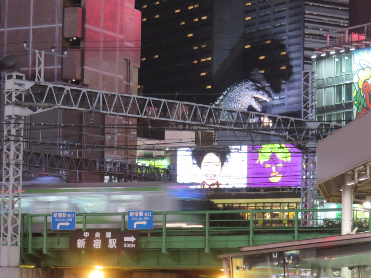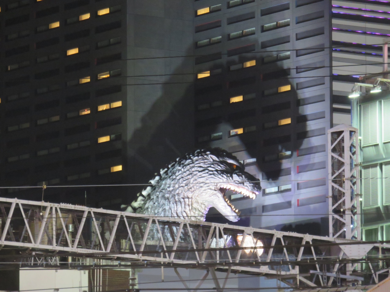 ゴジラヘッドが出現したときは歌舞伎町のドンキ付近から撮影して投稿させて頂きましたが、正面のアングルが好きになれませんでした。新宿の西口を歩いているときにスマホをかざしている観光客がいたので視線を向けるとゴジラの横がをが見えました。撮影可能な範囲は狭いです。手前にビルが有るので、直ぐに隠れてしまいます。今まで気にしていなかったため詳細は不明ですが、視界を遮っていたビルが解体されたような気がします。撮影ポイントは「思い出横丁」側の道路より。又は 延長線上の通りの向かいのパチンコや周辺です。夜はライトアップされていて、ビルにゴジラの陰もできていて、良い感じだと思います。