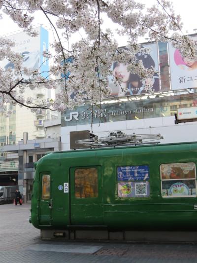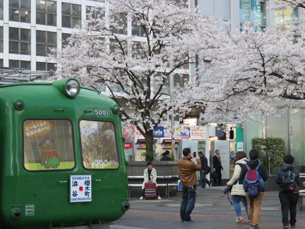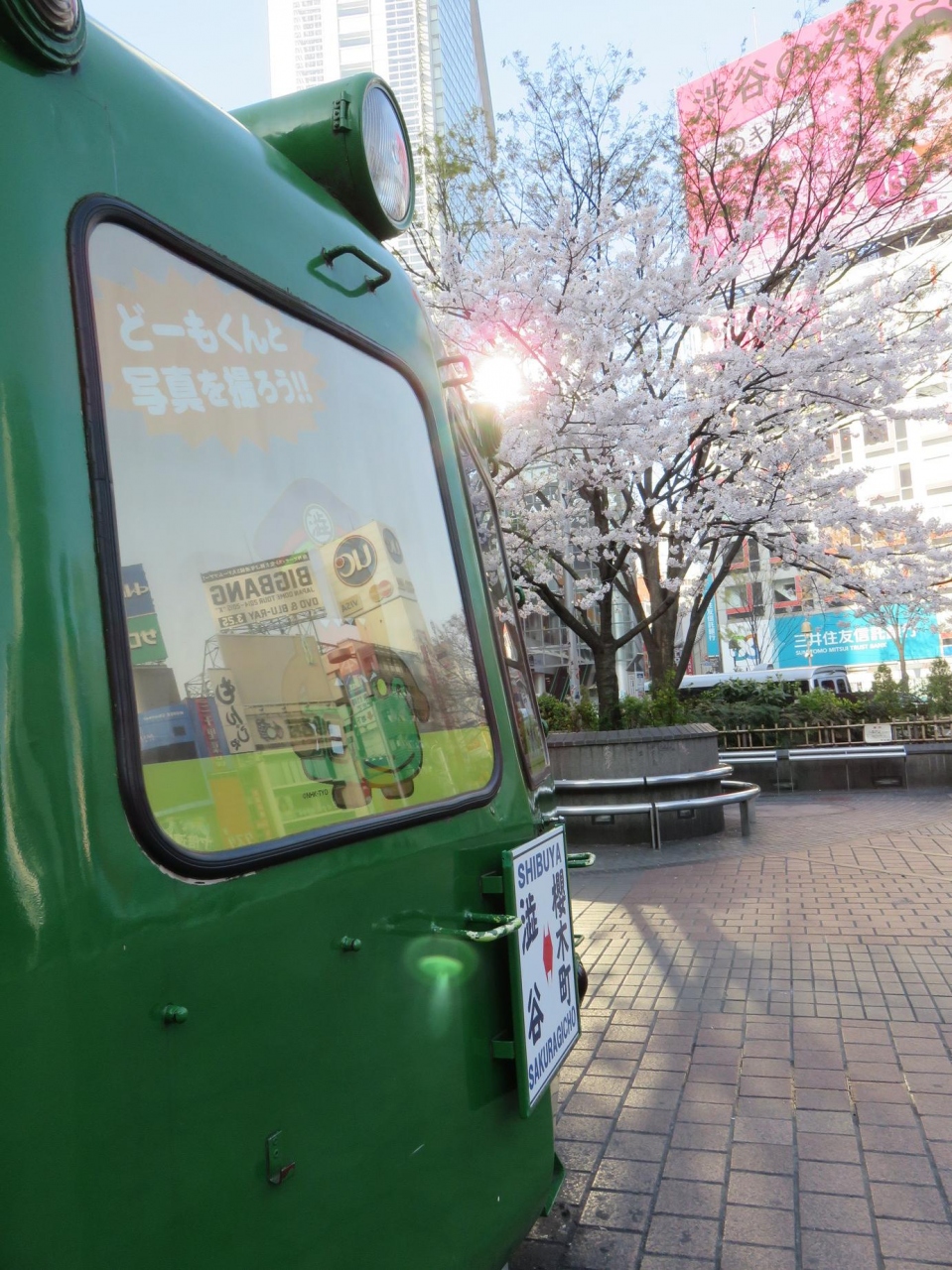 渋谷の駅前に桜が咲いており、ハチ公とのツウショットは構図的に難しいと思い、東急電車のモニュメントと一緒に撮影していました。朝早い時間帯だと人が居ないので撮影できますが、それ以外の時間帯では人が大勢いて撮影が難しそうです。