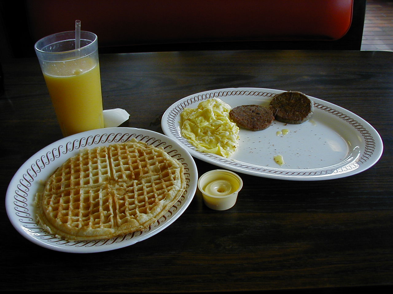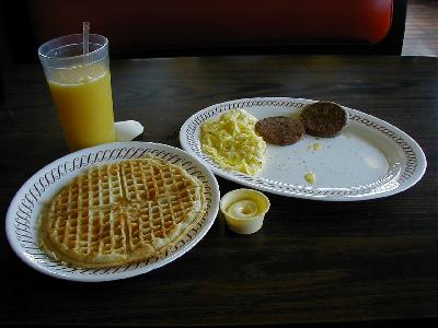 泊まったモーテルの敷地内にあった「ワッフルハウス」というワッフル屋で朝食を済ませました。ワッフル、ソーセージ、スクランブルエッグ、オレンジジュースで$7といったところです。ファーストフード感覚では少し高く感じましたが、本当はセットでもっと安いものもあるようです。食べきれないともったいないのでバラで注文した。量もちょうど良く、結構おいしかったです。