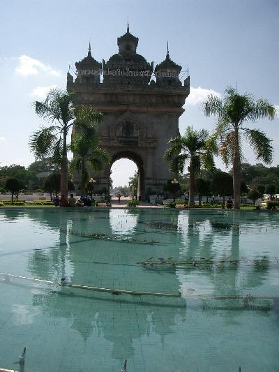 別名「アーヌサーワリー」という名前を持つパリの凱旋門をイメージして作られたといわれているようです。塔の展望台に登ることができますが、4カ所ある入り口のうち、開いているのは1つだけで、入り口にいる係の人に入場料を払って中に入ります。ガイドブックには1000kipと書いてありましたが、なぜか2000kip取られました。何も分からないのでそのまま払いましたが、こんな所でもぼったくられることがあるのでしょうか?階段を上る前に簡単なボディーチェックを受けます。あまりやる気がないのか、適当に思えました。これもテロか何かの影響なんでしょうか?螺旋状の階段を上ると4階くらいの所にはおみやげ屋さんがありましたが、値段は高めのようです。ここから屋外に出ることができます。もう一つ登って5階に行くとまたおみやげ屋さんがあります。中央に螺旋階段があり、最終的には6階くらいの高さまで行くことができ、ここからビエンチャンの街並みを見渡すことができます。