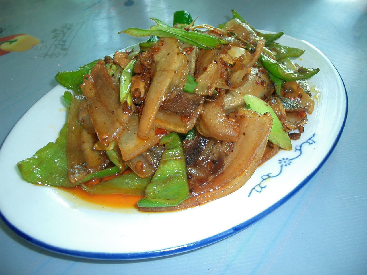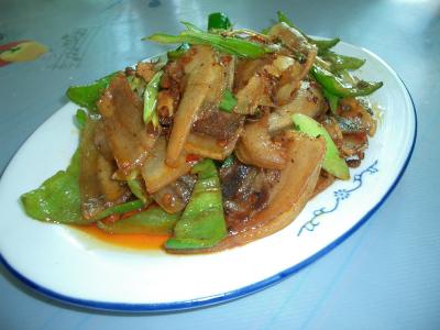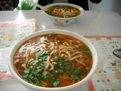 名前は忘れてしまいましたが、敦煌駅からメインストリートを2,3分歩いたところにある中華料理店に入りました。 メニューはたくさんあるのですが、想像の付く物だけオーダーしました。 回鍋肉(10元)、炸醤麺(5元)、揚州炒飯(6元)、地ビール(3元)でした。 おまけに出てきた湯(タン)です。 冬瓜のような物が入っていましたが、パクチーが効いていてちょっと苦手でした。