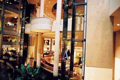 有名な正面ロビー奥の水槽は1~3階まであります。