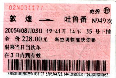 中国国内の列車のチケットは今現在日本で購入する事は非常に難しいです。 そこで頼りになるのは現地の旅行会社ですが、私の場合上海に友人がいたので手配してもらったのですが、そのときに言われたことを紹介します。 私は敦煌から吐魯番までのソフトベッドを予約したのですが、上海の旅行会社では取り合ってもらえませんでした。 そこで、現地(敦煌)の旅行会社に連絡してもらって確保することができました。 ガイドブックには最低3日前までに予約などと書かれていますが、実際には売り切れになってしまうことも多いので、早めに予約しておくことを薦めます。 最低でも一週間前ぐらいまでにコンタクトを取って確保しておいた方がいいでしょう。 料金は通常現地で現金と引き替えにチケットを受け取りになりますが、手数料(1枚当たり50元程度?)が必要になります。 カードなどは使うことができないことが多いので事前に確認しておきましょう。