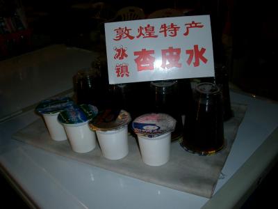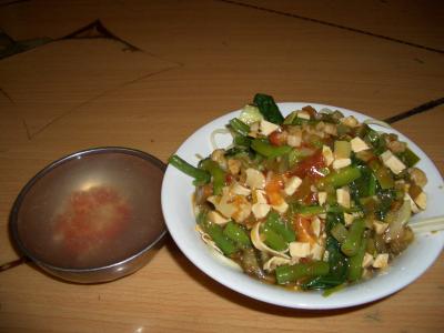 「四川永楽酒楼」は市場の中にあります。 冷たい麺の上に野菜類を駆けたような物を発見して入ってみました。 結構ボリュームのあるこの麺は「冷黄麺」といわれるものです。 結構辛かったのですが、なかなかおいしかったです。 スープが付いて、これで3元でした。