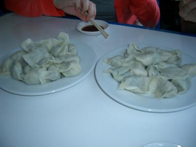 「敦煌こんどん餃子」は市場のレストラン街の中にあります。 ギョーザは種類もいっぱいありましたが、よく分からなかったので一番安い葱ギョーザ一皿だけにしておきました。 しかし、ギョーザも量り売りで、1斤(500g)単位となっているようでした。 8元でこれだけ出てきてしまい、食べ切れませんでした。