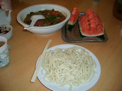 陽関へ向かう途中で、農家園と呼ばれるローカルレストランへ寄りました。 メニューはいろいろあるようなのですが、おすすめを訪ねると「菜麺」という麺を食べました。 別に盛られたピーマン、ナス、トマトなどが入った具を載せて食べます。 さっぱりしてなかなかおいしかったです。 料金は10元でスイカもついてきました。