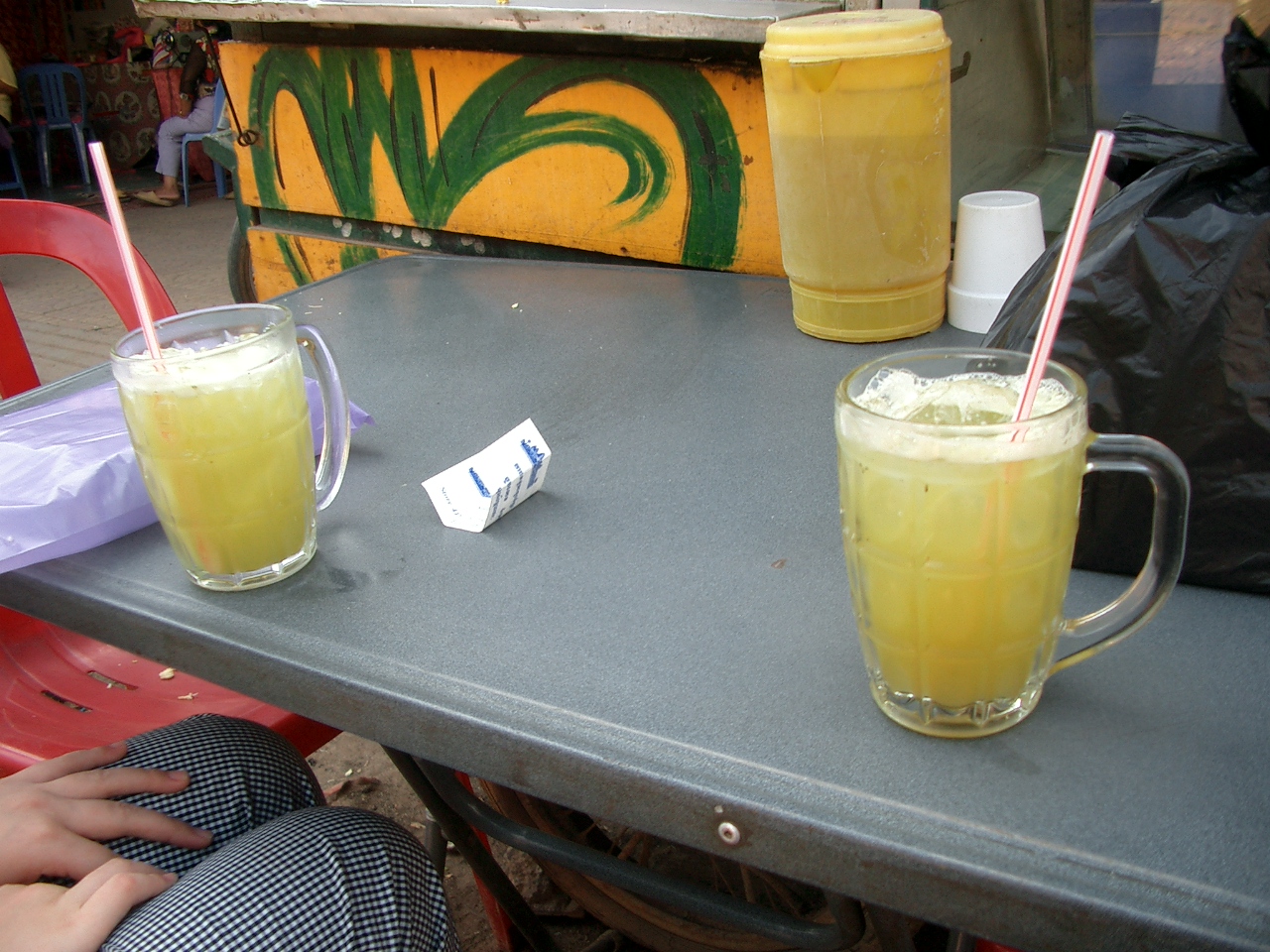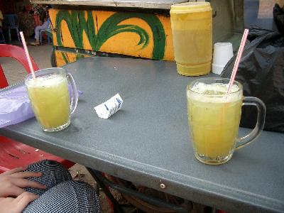 マーケットなどの屋台でよく見かける「さとうきびジュース」です。生のサトウキビからそのまま絞り出してジュースを作ってくれます。意外とさっぱりしていてそれほど甘くなく、滞在中には結構お世話になりました。1杯だいたい500リエルと安いので試してみてはいかがでしょうか?おすすめです。