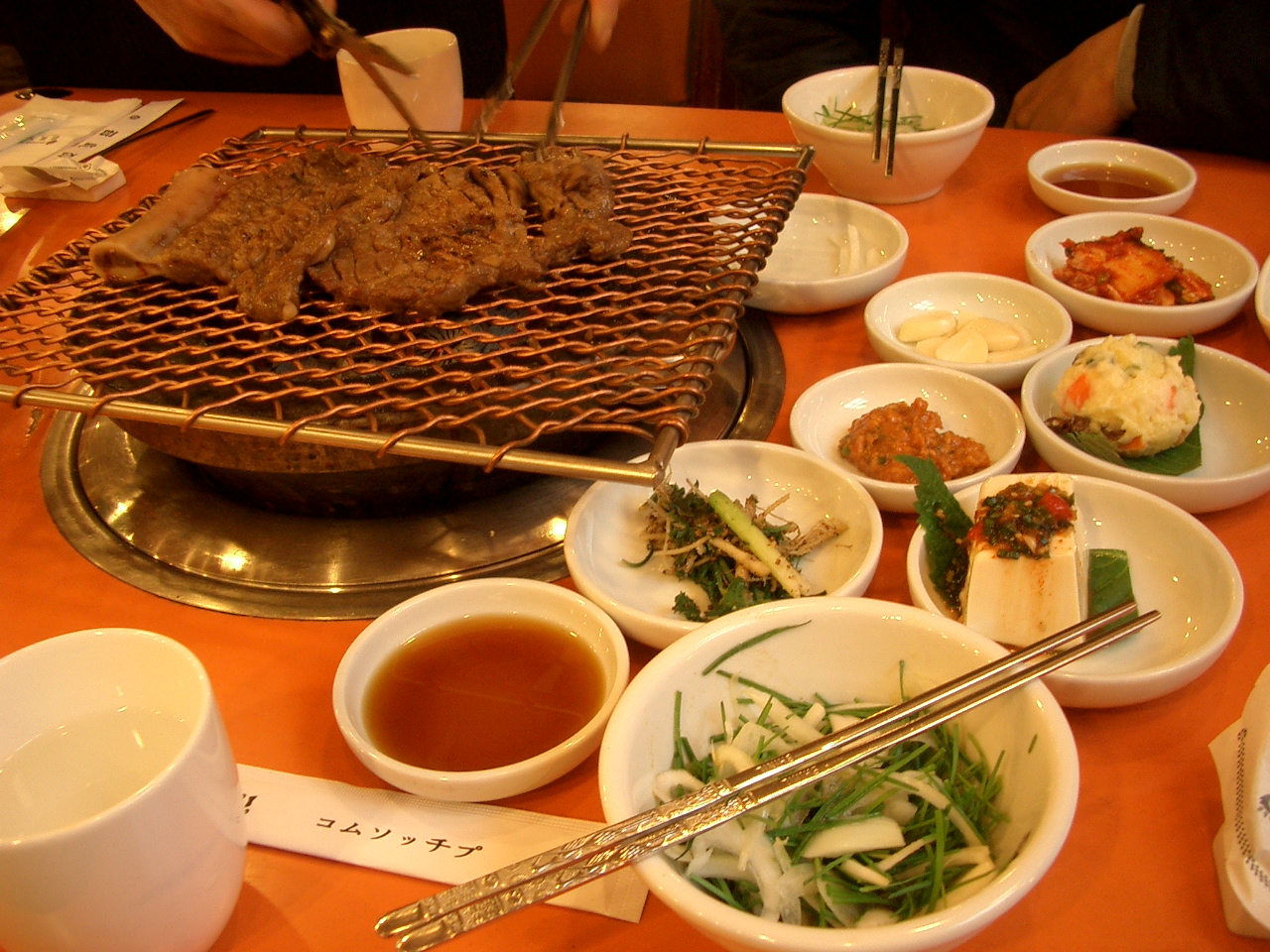 明洞にある「コムソルチプ」という焼き肉屋に行きました。 ドカンと網の上に肉が乗って、結構なボリュームです。 店の人が豪快にハサミで切ってくれました。 雑誌で取り上げられるなどして有名そうだったのでここに決めました。 しかし、味は良くボリュームもあるのですが、日本円で¥5000(2人)はちょっと高いのでは?