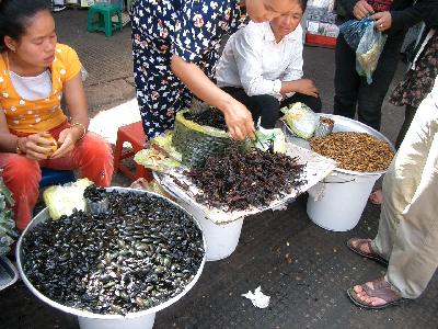 セントラルマーケットで見つけた昆虫屋さんです。もちろんコレは食用として売られていました。私は話には聞いていた「蜘蛛」を見たくて行ったのですが、とても食べる勇気がありませんでした。現地の人は袋に詰めてもらって買っていきます。勇気のある方はどうぞ試してみてください。そして、感想などいただければ幸いです。ちなみに写真は向かって左側からゲンゴロウ?、蜘蛛、サナギ系です。