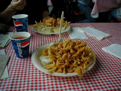 ケープコット観光に行ったときにプロビンスタウンで食事ができなかったのでUS−6沿いの店、モビーディックス(MOBY DICK\'S)というシーフード料理の店に寄ってみました。実は行きがけにここを通りチェックしていたのですが、昼時だったために結構混雑していました。だいぶ時間もずれたので待たずに食事にありつくことができました。メニューは豊富でセルフスタイルなので値段も安い。私はクラムのフライグリルを頼んだのだが山盛り出てきて食べきれずに残してしまいました。(すごくおいしかった)約$10〜といった感じですがものすごくボリュームがあるので満足です。