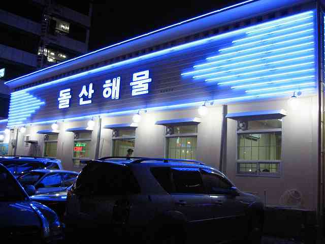 「ドゥルサネムル」は麗水の新市街にある海鮮料理の店です。 友人の紹介で連れて行ってもらったので、どこにあるかはよく分かりませんが、繁華街のすぐ近くでした。 麗水は新鮮な魚介類が食べられますが、私たちが食べたものは、お店の人がおすすめの「ハモサシミ」という料理で、W50,000でしたが、二人で食べきれないほどのコース料理でした。 韓国でも「ハモ」は「ハモ」ですが、「サシミ」は名前ばかりで、何故か鍋料理でした。 ちょっと高く感じますが、ボリュームも満点で、大満足でした。 写真が一枚しか掲載できないので、とりあえずお店の写真を掲載します。