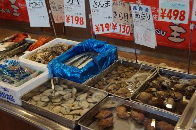 友人から頼まれた道の駅マグネットはここで終わり。生牡蠣が食べられるとのことで寄ってみる。海を背に左側建物に2軒のカニを扱うお土産屋さん。右側建物では活魚活貝を格安で販売中!宗八なんて一袋98円。