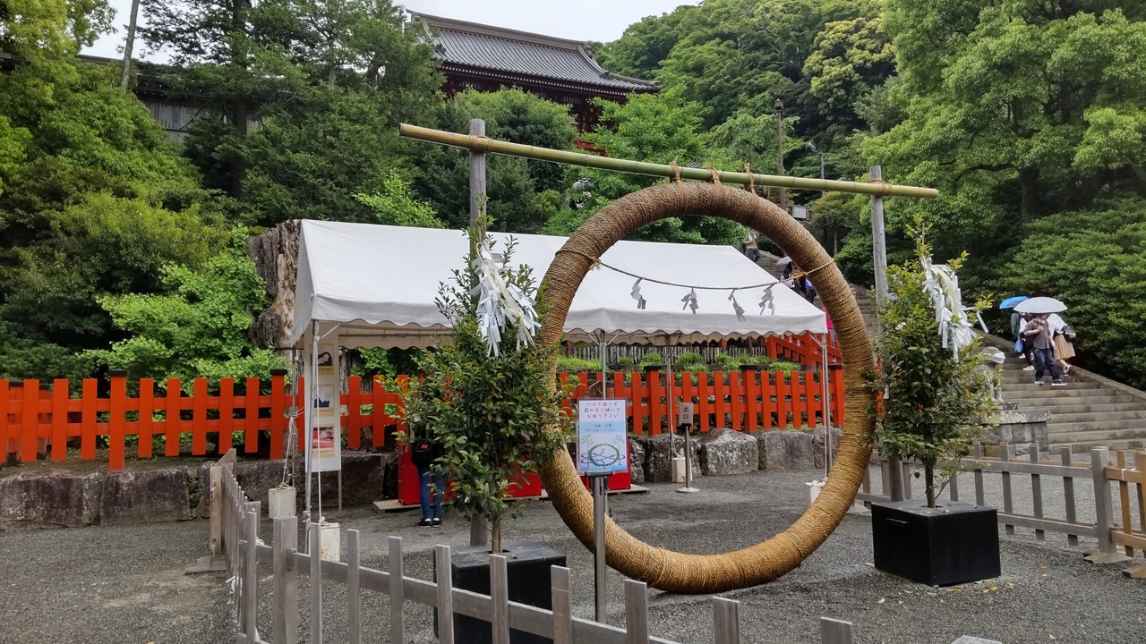 早くも境内に夏越大祓に向けて独特な茅の輪が設置されていて自祓することができる。あいにくの雨空で拝殿前から海岸線は見えないが、小雨の平日でも参詣者などの人出があり賑わっている。多くの人の手によって良く整備された境内を歩くと気分爽快、嫌なことが続いても頑張る気力を得られるかもしれない。