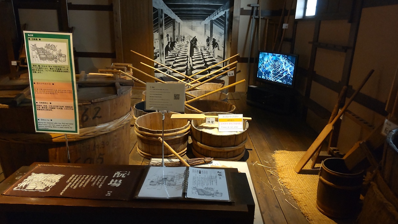国の重要有形民俗文化財に指定された数々の酒造資料は圧巻だ。酒造りの映像紹介もあり、腰掛けてひと休みしながら視聴できる。長靴で山卸する意外な姿が流れたが、酛摺りの紹介は短くあっさり。