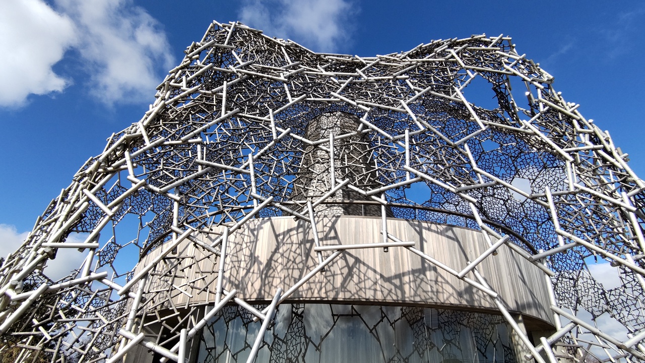 外部のステンレス配管を繋いだ網状の3次元造形は独創的で面白い。季節に寄って変わる照明演出は良さそうです。