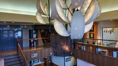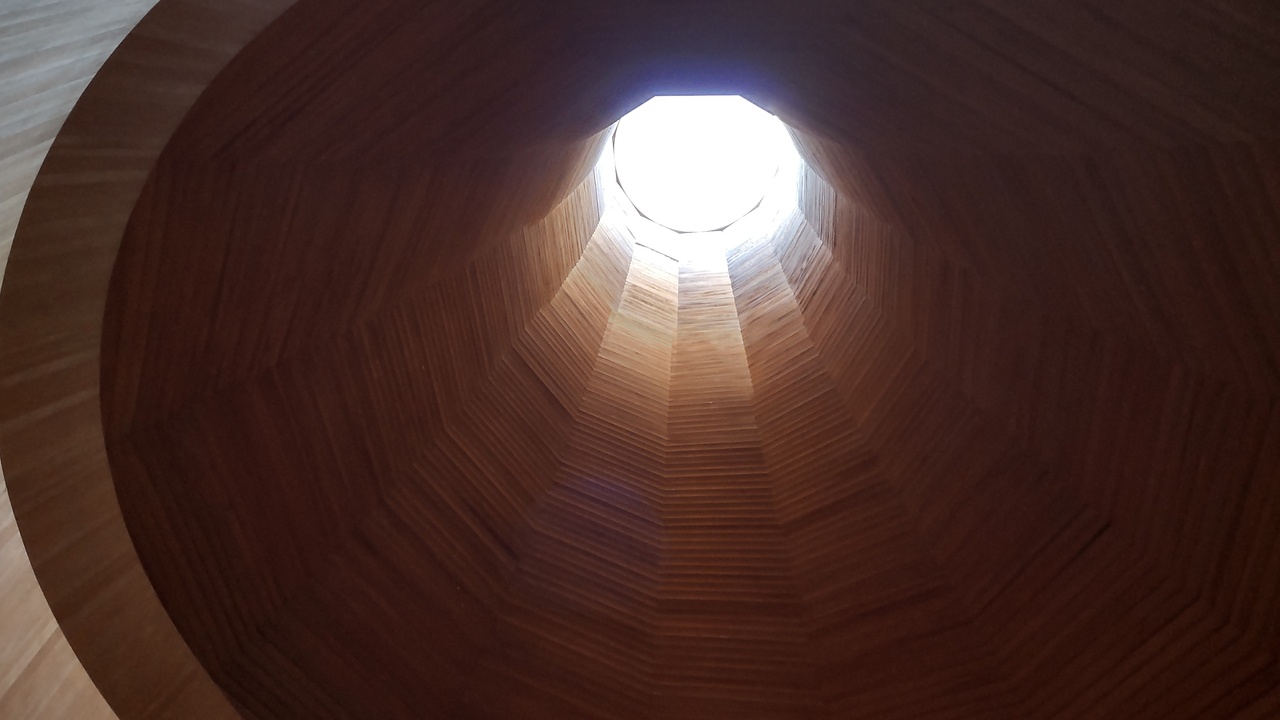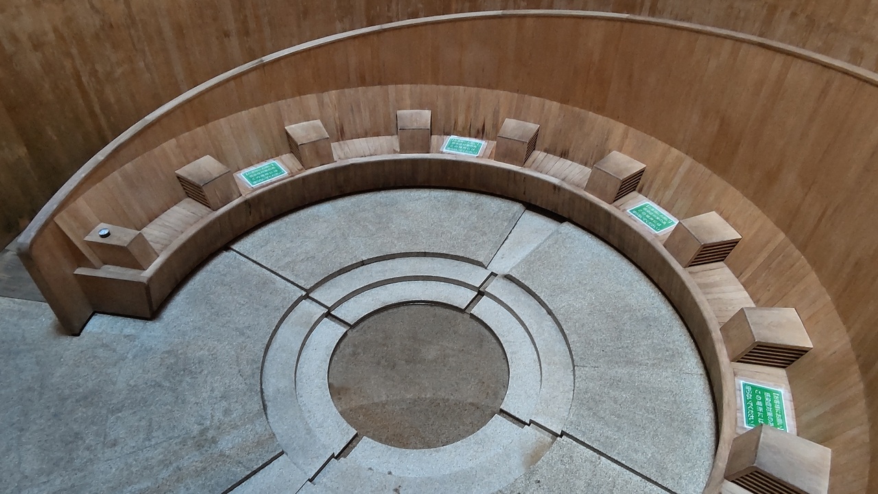 情報誌の目を引く写真掲載で興味を持ち、内部まで見学してみました。第1印象は想像より小さい。入口の水面の演出が無くなっていて、まだ新しいのに廃れたのかと不安感が増大。構造物は上部へは上がれず展望台と呼ぶのは実体と違う。板張りの壁は紫外線劣化による退色だけでなく、通風が良くない部分はカビ、苔が生え。スタック効果で自然通風、開いた天井から入って床に溜まった水の気化熱で夏季は涼しいと紹介されてますが、内部は狭く用途が限られます。照明学会の受賞歴があるようですが、建築物としてはどうなんでしょう。