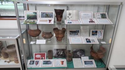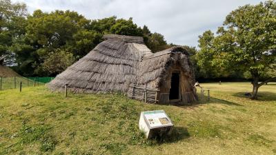 駐車場からは断崖の木々で全く見えないが、断崖に設けられた遊歩道を抜けると、想像に反する広い草原の公園があり、一角に竪穴式住居が復元されている。事務所に貴重な土器の資料と発掘調査の写真パネル展示があり、お手洗い、飲料自販機もある。草刈されていて見晴らしが良く、テーブル席もあるので、おやつ持参で5000年の悠久の歴史に浸ってゆったり過ごすにはもってこいだ。