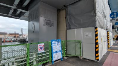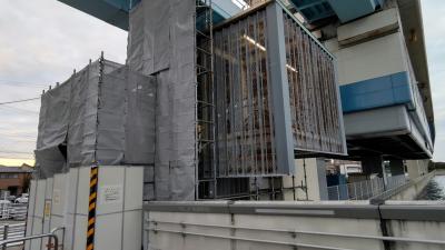 金沢八景駅から平潟湾を渡って1つ目の野島公園駅は野島運河に沿った立地で、運河側の階段が運河に迫り出している。穴のあいた外装は防錆が効いていて劣化に気付きにくいが、階段の構造材や屋根は塗装が劣化し発錆が目立っていた。道路を跨ぐ反対側の階段が補修されたのに続き、運河側の補修工事が始まった。