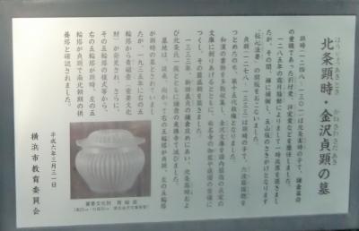 赤門から参道を通り仁王門から金沢文庫方面の左手に向かって奥の一段高い金沢山のふもとに、称名寺を造営した金沢北條二代目と三代目の墓所がある。残念ながら滅亡の憂き目にあい、子孫の手厚い保護が行き届かずに朽ちているようにも感じられるが、菩提寺の努力などで開発から逃れて、貴重な原形を留めた史跡として残っている。