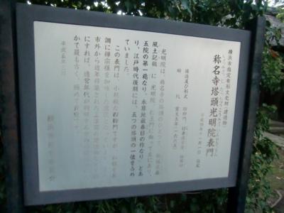 横浜市金沢区の称名寺の隣に立地する光明院の表門であり、称名寺の参道に面している。横浜市の文化財の指定を受けている貴重な建物だが、残念ながら光明院の境内側の手入れはあまりよろしくなく見栄えが冴えない状況である。最盛期の状況が想像できないが、称名寺とともに再興を期待するが賛同されるスポンサーが居ないだろうか。